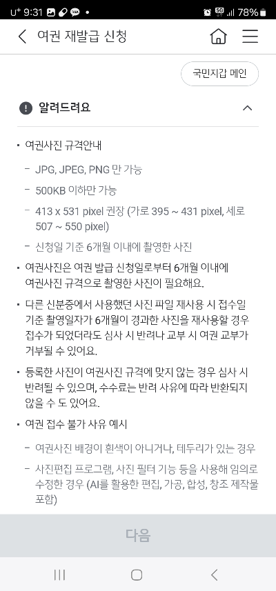 여권정보등록 후 KB Pay 결제! 신청완료. 이후 외교부에서 사진 규격 확인후 승인. 사진규격이 맞지 않으면 반려가 될 수 있으니 여권사진 준비 잘하시기 바랍니다. 요즘 집에서 직접 찍어서 인쇄하시는 분들이 많은데 저도 사진은 집에서 찍고 인화는 사진관에서 규격에 맞게 했습니다.