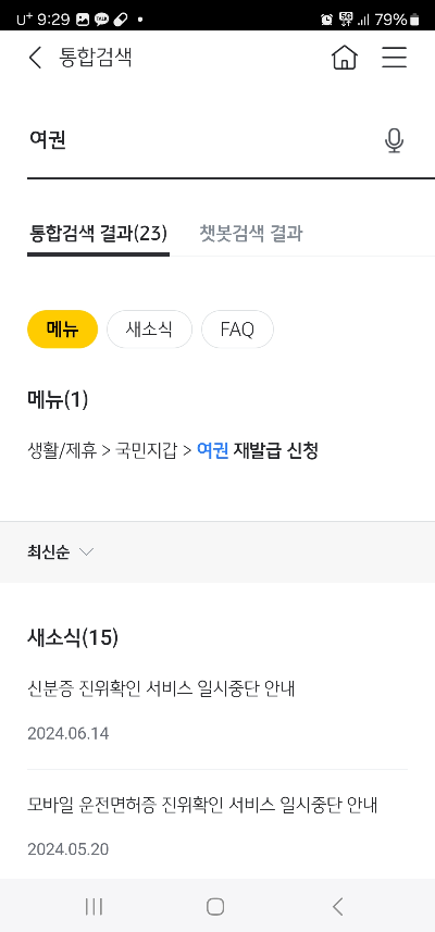 어플에 접속하여 오른쪽 위 3줄 메뉴 누르고 '여권'을 통합검색합니다. 그리고 결과에서 '여권재발급신청'을 선택하면 국민지갑으로 이동합니다. 아래로 조금만 내리면 여권재발급 신청 버튼이 나타납니다.